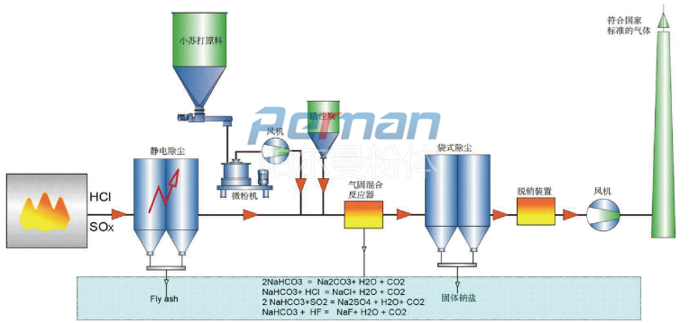 煙氣中含有大量的酸性氣體,經(jīng)過大量的數(shù)據(jù)和實(shí)驗(yàn),只有碳酸氫鈉(小蘇打, NaHCO3)小到一定的程度,其才能和煙氣中的酸性成分產(chǎn)生最大效率的反應(yīng)。它通過化學(xué)吸附去除煙氣中的酸性污染物,同時(shí)還可通過物理吸附去除一些無機(jī)和有機(jī)微量物質(zhì)。此工藝將碳酸氫鈉細(xì)粉直接噴入高溫?zé)煔?。在高溫下碳酸氫鈉分解生成碳酸鈉Na2CO3、H2O和CO2。